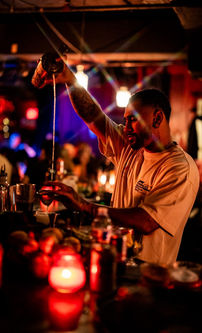 Craft cocktails, local brews, speakeasy setting.